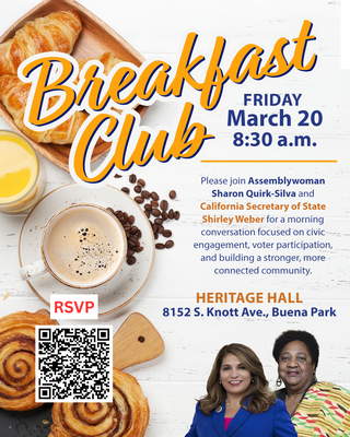 Heritage Hall Please join Assemblywoman Sharon Quirk-Silva and California Secretary of State, Shirley Weber, to enjoy a morning conversation focused on civic engagement, voter participation, and the importance of strengthening our democratic process while connecting with community leaders over breakfast.Location