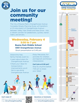 City of Buena Park Community Meeting Sign up for free E-News today! Date and Time Wednesday Feb 4, 2026 5:30 PM - 7:00 PM PST Location Buena Park Middle School 6931 Orangethorpe Avenue, Buena Park, CA 90620 Set a Reminder Enter your email address below to receive a reminder message. Email address Select the amount of Days before the event -- Select Days Before Event -- 1 Day 2 Days 3 Days 1 Week Captcha Validation Please complete the Captcha Submit Images Gallery Image × Set a Reminder Enter your email address below to receive a reminder message. Email address Select the amount of Days before the event -- Select Days Before Event -- 1 Day 2 Days 3 Days 1 Week Captcha Validation Please complete the Captcha Submit Share × Print Email Add to Calendar Facebook Twitter LinkedIn Tell a Friend × Select Calendar Type × Google Yahoo iCal (Outlook, Apple, or other)