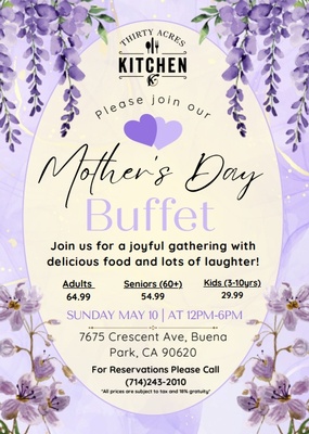 Make this Mother’s Day unforgettable at Thirty Acres Kitchen—proudly ranked among the top 10 award-winning restaurants in the heart of Buena Park. Treat Mom to a day filled with love, exceptional cuisine, and moments you’ll cherish forever. From beautifully crafted dishes to a warm, inviting atmosphere, it’s the perfect place to celebrate everything she means to you. Reserve your table today and give her the celebration she deserves. For reservations, please call (714) 243-2010.Date and Time