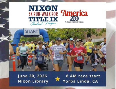 18001 Yorba Linda Blvd. Celebrate the women and girls in your life in this family-friendly event to commemorate the achievements of Title IX, the landmark equality legislation signed by President Nixon in June 1972. Bring your family, friends, sports teams and community groups to the NIXON 5K FOR TITLE IX and run (or walk) this moderate course following Yorba Linda’s El Cajon Trail. Athletes are encouraged to wear their favorite team gear supporting female sports! This is accessible for runners of all levels; strollers are welcome and dogs are allowed. Following the race, guests are invited to stop by the vendor fair in the Library parking lot! Race starts at 8:00 AMDate and Time