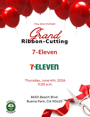Event Time: Thursday, June 4th Join us for a special ribbon cutting celebration at 7-Eleven as we officially welcome them to the City of Buena Park and the community! The celebration will take place on Thursday, June 4th, with festivities running from 10:00 AM to 6:00 PM. The official ribbon cutting ceremony will begin at 11:30 AM. Guests are invited to enjoy a full day of excitement, including a live DJ throughout the event and a special mariachi performance at 5:00 PM. Come meet the team and take part in this exciting milestone. We look forward to celebrating with you!Date and Time