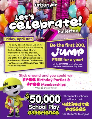 Urban Air Fullerton Anniversary Bash Sign up for free E-News today! Date and Time Friday Apr 10, 2026 Website https://www.urbanair.com/california-fullerton/?utm_source=google&utm_medium=cpc&utm_campaign=walk-in&utm_content=brand&gad_source=1&gad_campaignid=23442993354&gbraid=0AAAABBtLk45D-20EMfoiQVe524hMffQcZ&gclid=CjwKCAjw687NBhB4EiwAQ645dtFsctRIouiuPMVBPfkGnfu5Gf3InNnMW6Uea8sfy22IvP9IJJSLRxoCgC0QAvD_BwE Set a Reminder Enter your email address below to receive a reminder message. Email address Select the amount of Days before the event -- Select Days Before Event -- 1 Day 2 Days 3 Days 1 Week Captcha Validation Please complete the Captcha Submit Images Gallery Image × Set a Reminder Enter your email address below to receive a reminder message. Email address Select the amount of Days before the event -- Select Days Before Event -- 1 Day 2 Days 3 Days 1 Week Captcha Validation Please complete the Captcha Submit Share × Print Email Add to Calendar Facebook Twitter LinkedIn Tell a Friend × Select Calendar Type × Google Yahoo iCal (Outlook, Apple, or other)