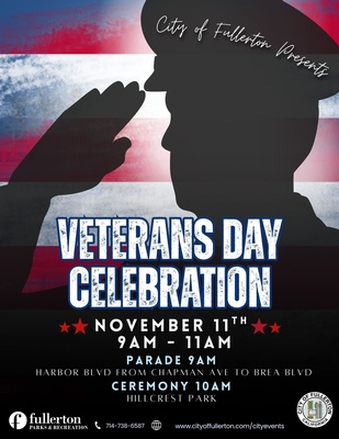 Date: Tuesday, November 11, 2025 Join the City of Fullerton Parks & Recreation Department for the 2025 Veterans Day Parade & Ceremony, honoring the brave men and women who have served our country. The parade begins at 9:00 a.m. at Harbor Blvd. and Ellis Place, marching north along Harbor Boulevard and concluding at the Hillcrest Park Great Lawn. At 10:00 a.m., the Veterans Day Ceremony will take place next to the Fullerton War Memorial, featuring: Patriotic performances by vocalist Haley Copello Wreath placements honoring those who served Gun salute by the Fullerton Police Department “Taps” performed in remembrance of fallen heroes This year’s keynote speaker is Captain Nelson Laracuente, Commander of Able Company, 1st Battalion, 160th Infantry Regiment. Since enlisting in 2015, CPT Laracuente has served in a variety of leadership roles, both domestically and overseas. He brings with him a deep commitment to “put Soldiers first” and is currently pursuing a Doctorate in Education at USC. The event is free and open to the public. All community members are invited to attend and pay tribute to those who have defended our nation’s freedom. Parade Participants: No children or pets are permitted in the parade. Only official flags carried by JROTC units are allowed; banners are not permitted. For safety, pets are not allowed at the ceremony or parade. For more information, contact the Fullerton Parks & Recreation Special Events Team at (714) 738-6587.Date and Time
